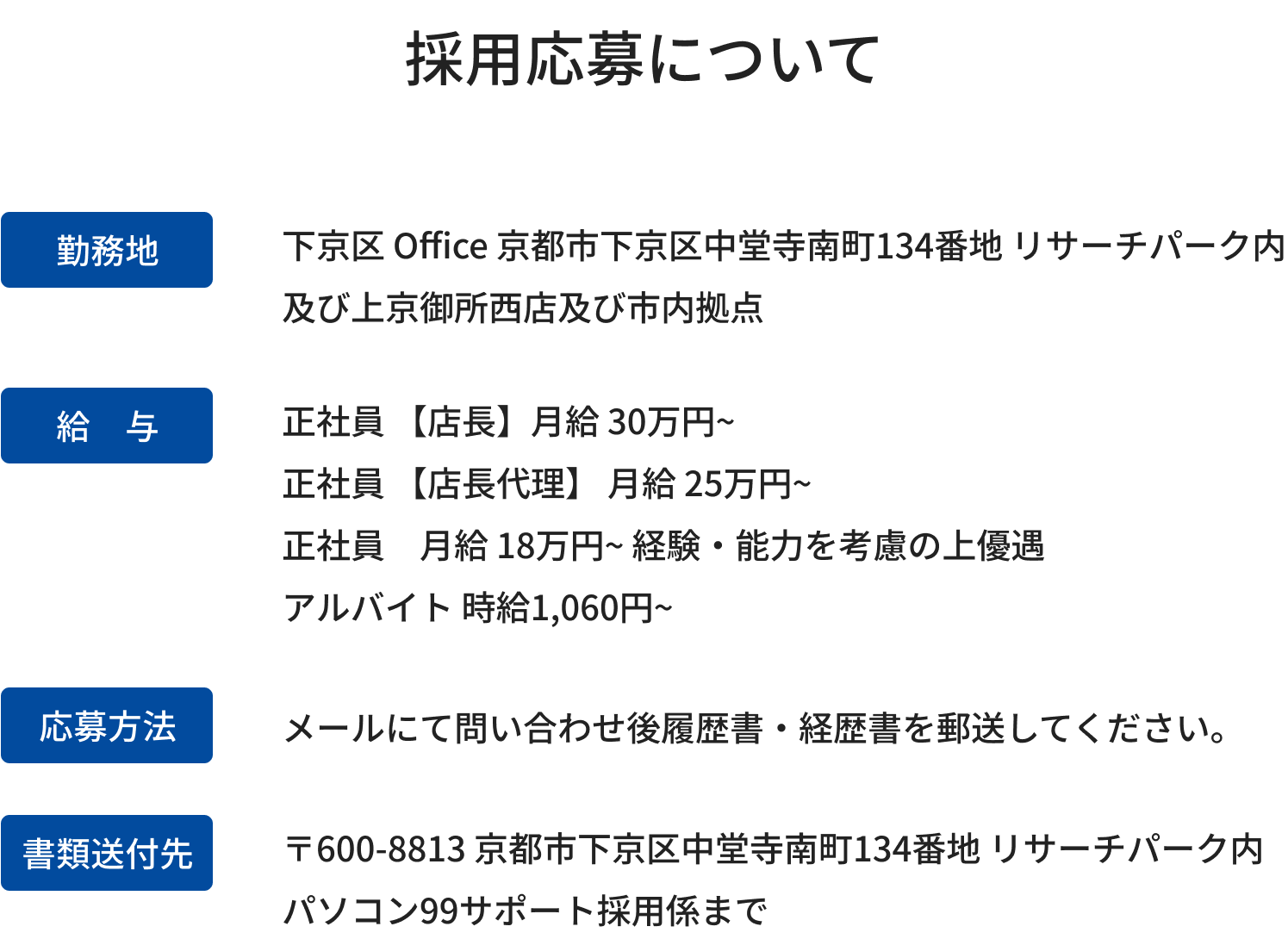 パソコン99サポートはパソコンサポート・コンサルティングを通して京都から発信するベンチャー企業です。 あなたの思い・熱意・ お持ちのスキル・技術力を発揮して頂ければそのまま成果としてダイレクトに跳ね返ってきます。そんな会社でやりがいのある仕事をしませんか。