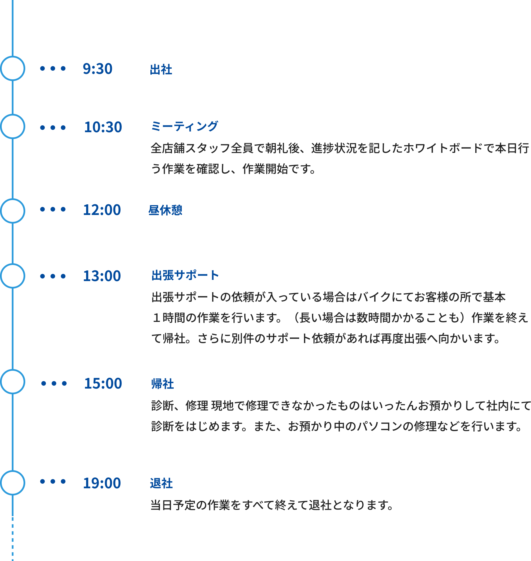パソコン99サポートで働くのがおすすめパソコン99サポートはお客様のパソコンに関わるトラブルやお困りごとを店舗や出張訪問にて解決するサービスを提供しています。 トラブル解決だけでなく日々お客様の立場に立ってより良いサービスを提供しお客様に喜んで頂くことを第一に技術力向上とサービス力向上に努めています。